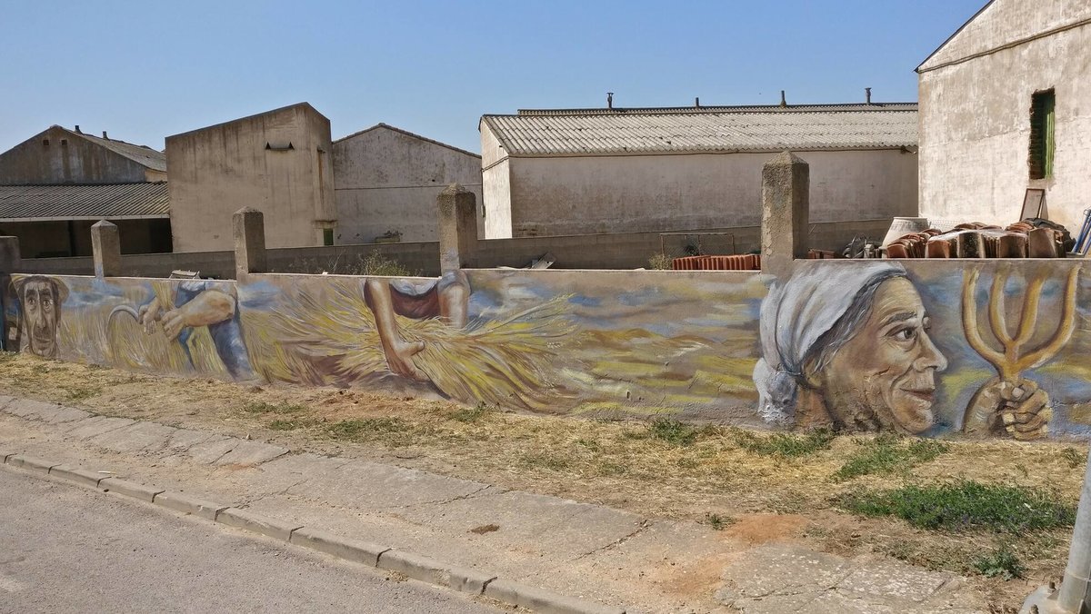 En este extenso mural, la autora nos retrata varias escenas del campo, desde la siembra hasta la siega del cereal y representa la relación entre el tiempo y estos trabajos. En él podemos ver los rostros detallados de las gentes del campo, sus manos y los utensilios usados antiguamente en la recolección, como son la hoz o la horca. Duras tareas que nuestros abuelos tantas veces realizaron en años pasados y que ahora son más fáciles