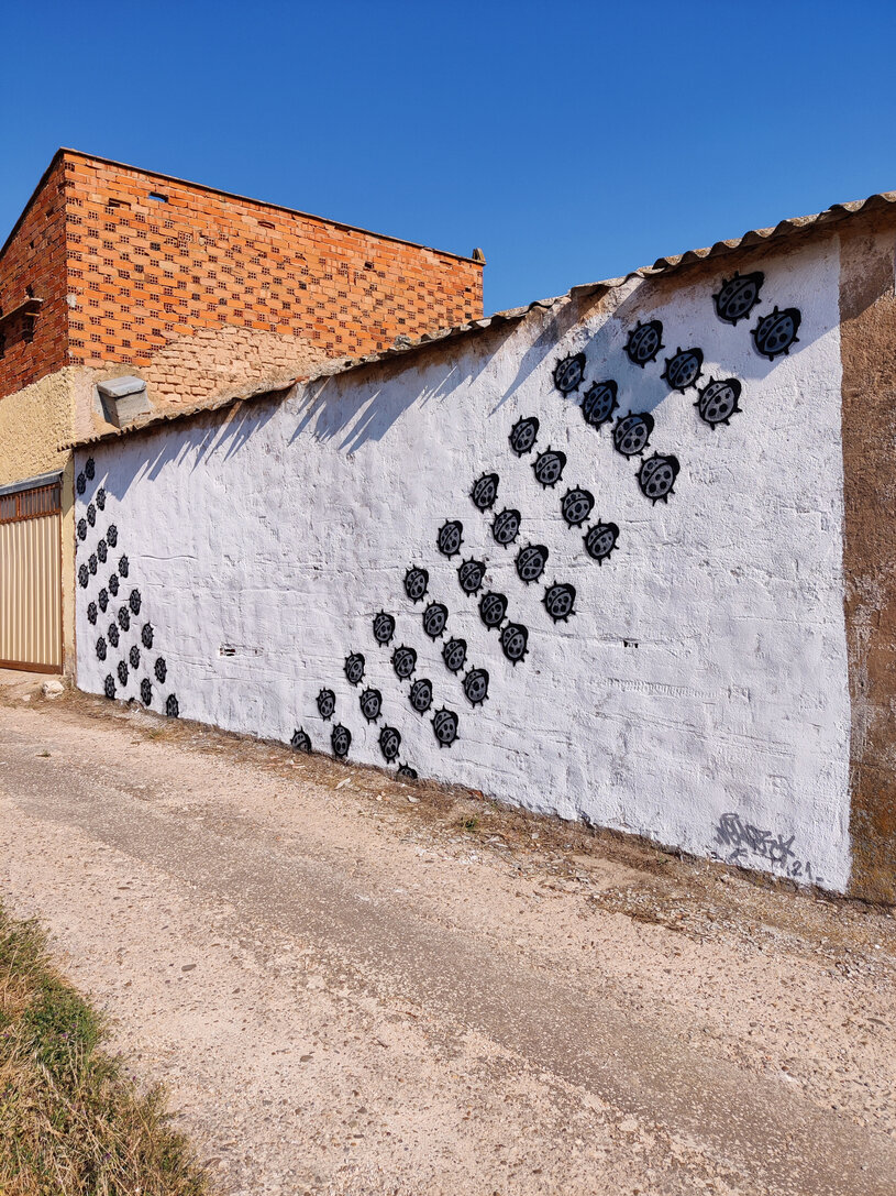 El mural representa por medio de mariquitas esos paseos de los números durante la hora de asueto, uniformados de un color triste y apagado como el gris. Pero de ahí surge una rebelión al sistema establecido, un enamoramiento de uno de los números, que opta por el individualismo y renuncia al nosotros como sociedad. Esa rebelión esta simbolizada por medio de la mariquita amarilla a la cual se le desprende su uniforme gris y deja observar su color alegre, el cual destaca por encima de todos los demás.